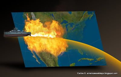 The ship then left a tail of fire which stretched across 2 3rds of the land of the United States filled with fire from the Mississippi river to the west coast of California. but the east coast was covered by sea.